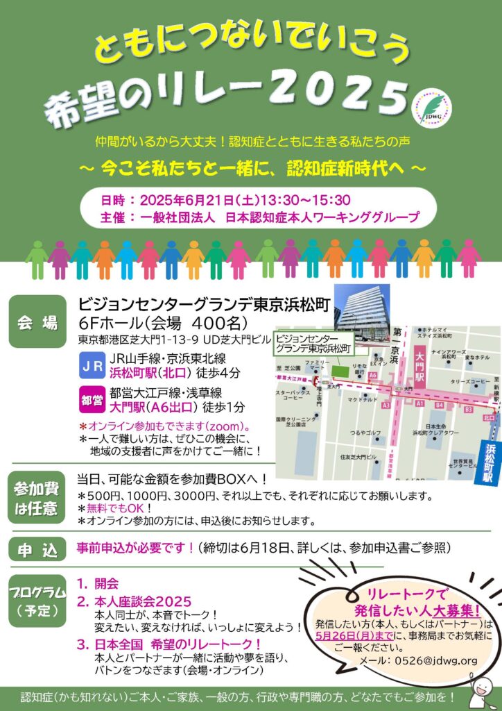 日本認知症本人ワーキンググループでは、「ともにつないでいこう~希望のリレー2025」を開催いたします。(開催は終了しました。ありがとうございました)